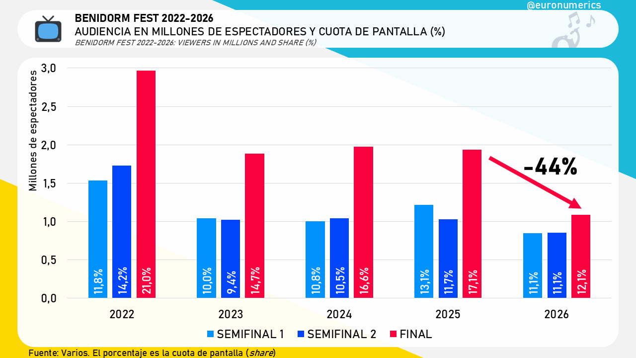 No participar en Eurovisión, un horario nocturnal o caer en un día tan particular como San Valentín, entre otros factores, pueden estar detrás de esta caída que flaco favor le hace al Benidorm Fest.