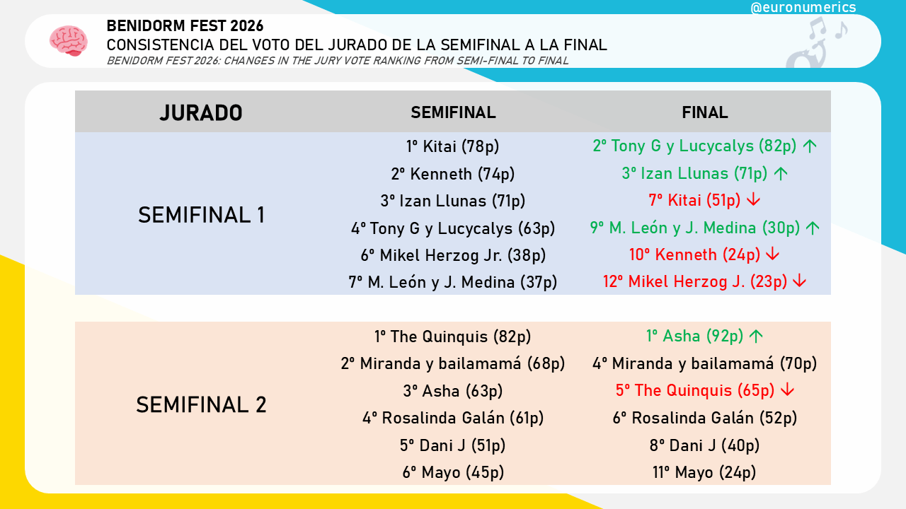 Empecemos con las clasificaciones del jurado. De los clasificados en la semifinal 1, todo cambió. Lo más destacable es el ascenso de Tony G y Lucycalys, que pasaron de ser la cuarta opción a la primera y el descenso de Kenneth de la segunda opción a la quinta. El cambio entre los dos es fuerte (aunque los sistemas de puntación fueron distintos): Kenneth pasó de estar 11 puntos por delante de los ganadores del Benidorm Fest a estar 58 puntos por detrás.
