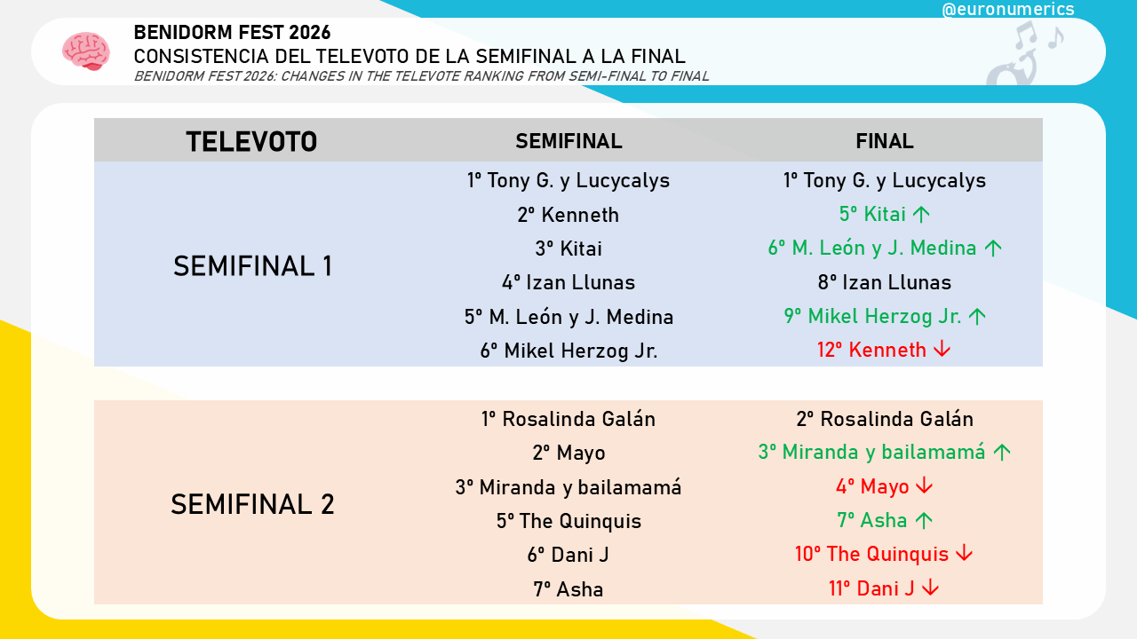 El aumento del número de participantes seguramente trajo más variabilidad en las posiciones durante la semifinal y la final. No obstante, destacan 4 participantes: Asha y las divorciadas María León y Julia Medina subieron en todos los criterios y The Quinquis y Kenneth bajaron unánimemente en los tres.