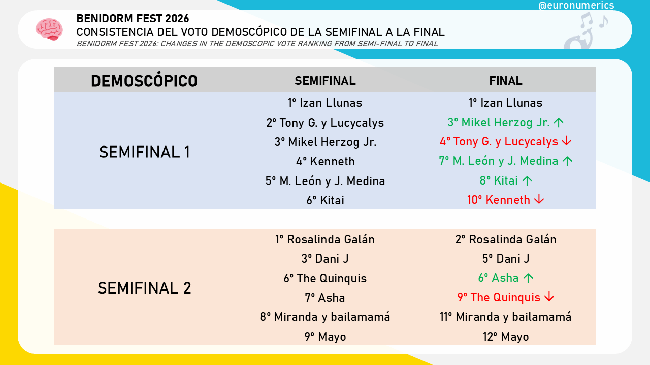 El aumento en el número de participantes en la final seguramente esté detrás de este mayor desacuerdo entre televoto y demoscópico. A la vista de los resultados parece que el televoto puntúa mejor a artistas con un fenómeno fan consolidado (en la forma que sea) mientras que el demoscópico premia a otros más noveles.