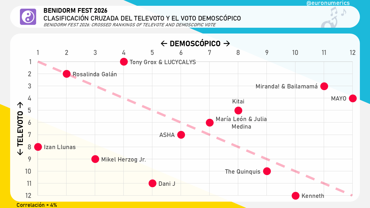 Es interesante destacar que arriba a la derecha están los más favorecidos por televoto y menos por el demoscópico (Mayo, Miranda! y bailamamá), mientras que abajo a la izquierda están los que el demoscópico encumbró y el televoto hundió (Izan Llunas, Mikel Herzog Jr. o Dani J).