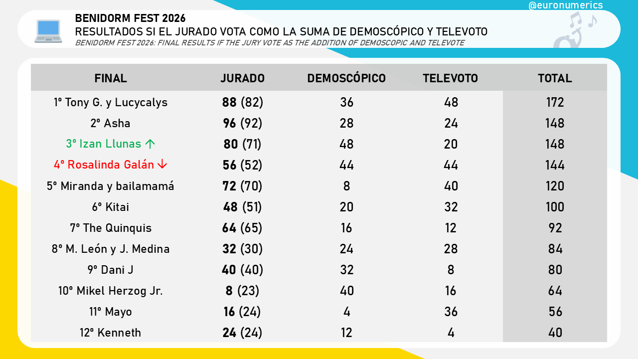 Igual que decíamos de las semifinales, este sistema de puntuación no cambia prácticamente nada en la final: tan solo Rosalinda Galán perdería el tercer cajón del podio en favor de Izan Llunas (y no sube al segundo porque desempataría el jurado).
