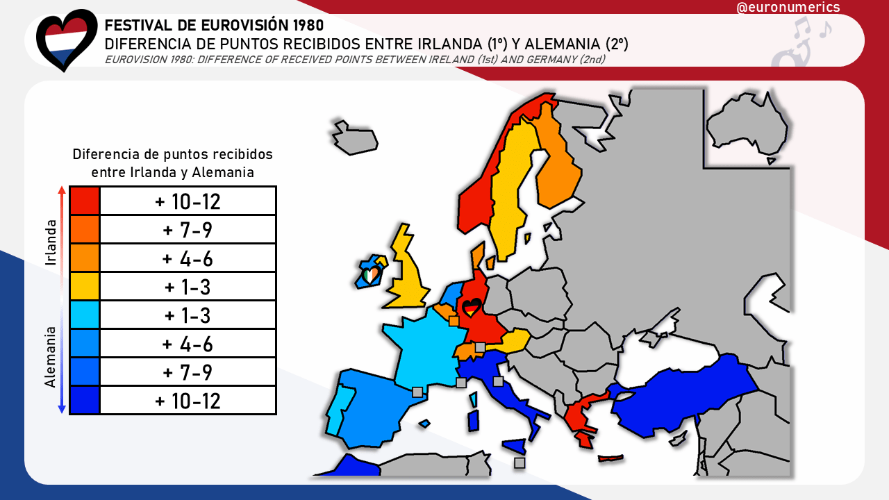 Recordemos que desde 1975 ya se utilizaba el sistema de puntuación actual de 1 a 8, 10 y 12. Para iniciar el análisis hemos representado en un mapa la diferencia de puntos que recibieron el primer clasificado, Irlanda, y la segunda, Alemania. Los tonos cálidos indican que ese país votó más por Irlanda y los tonos fríos que se valoró más a Alemania.