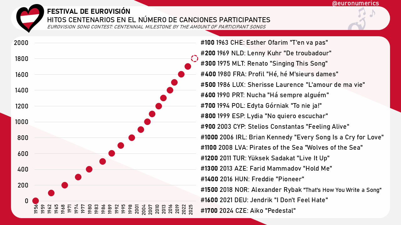 La previsión es que la canción 1.800 suene 2027, es decir, otros 3 años después de la 1.700. Al mismo ritmo, la canción número 2.000 podría sonar en 2033, año arriba año abajo y la 3.000 seguramente antes de 2060. Os lo contaremos con la garrota en la mano.