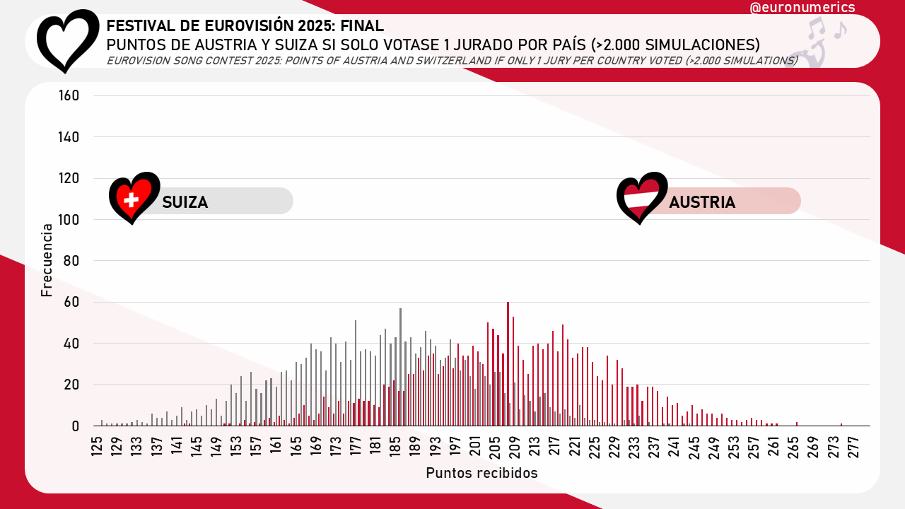 ¿Qué vemos en el gráfico? Lo primero es que la distribución de resultados de Austria (rojo) está más a la derecha, tiene puntuaciones mejores que las de Suiza… aunque no siempre. Lo cierto es que hay una amplia franja de coincidencia entre ambas distribuciones. Al tomar solo un jurado el resultado es muy volátil, de hecho las distribuciones están aplanadas y en el 25% de los experimentos Suiza queda por delante de Austria. Otro matiz importante es el número de puntos. La moda, el resultado más repetido para cada país, es 208 para Austria y 186 para Suiza, sensiblemente lejos de los 258 y 214 que, respectivamente tuvieron cada uno en la final.