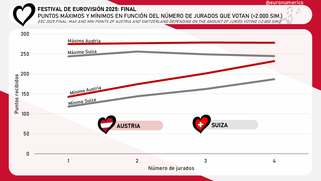 Lo que hemos visto es el caso extremo del primer y segundo clasificado. Dejadme que lo representemos de otra manera. En el siguiente gráfico vamos a ver el valor máximo y el mínimo que obtiene cada país para cada uno de los 4 tipos de simulaciones en Austria y Suiza. Es decir, para cada país tenemos un par de líneas: la de arriba representa el máximo de puntos y la de abajo el mínimo que tienen en cada simulación.