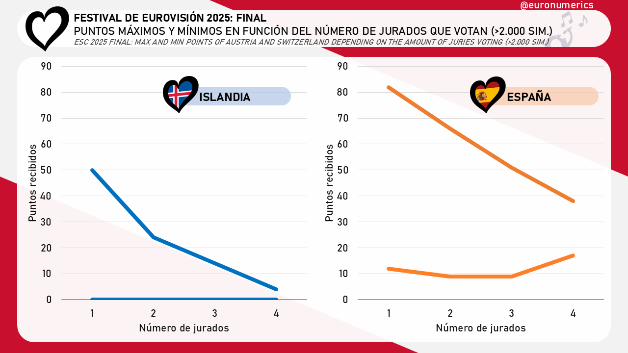 El comportamiento de ambos pares de líneas es similar. La línea de máximo es prácticamente plana, está capada, independientemente del número de jurados. La que cambia es la línea inferior, la línea del mínimo. Cuantos más jurados tengamos en cuenta, más puntos se garantizan estos países. ¿Por qué? Porque hay menos espacio para los expertos díscolos y el resultado es más uniforme, quedándose los puntos los países que han gustado más en general.