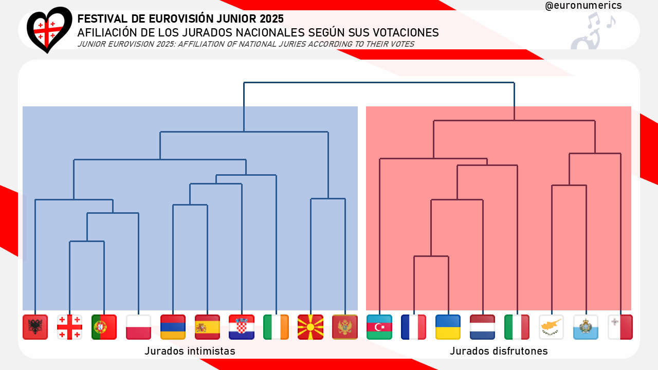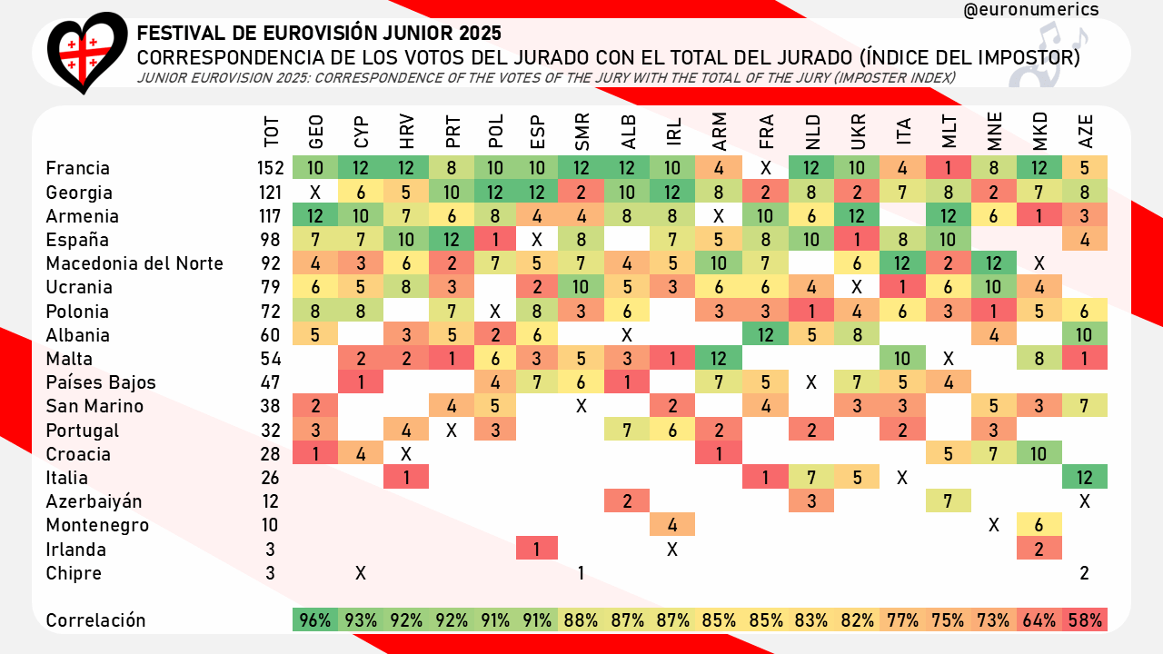 Parece como si en Eurovisión Junior solo jugaran tres países: Francia, Georgia y Armenia. Estos países, a los que se puede sumar Ucrania y España polarizan los resultados frente a los demás. Desgranamos estos análisis y otros sobre el voto del jurado en el blog, que dejan entrever que hemos tenido jurados intimistas y otros disfrutones. ¿Qué jurados han sido más justos y cuáles más sospechosos?