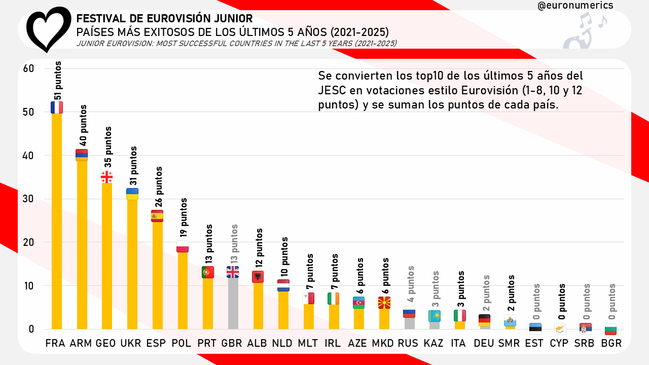 El festival junior últimamente parece cosa de unos pocos países. En el siguiente gráfico se muestra el éxito acumulado de cada nación en las últimas 5 ediciones (2021-2025). Para cada año se asignan puntos dando 12 al ganador, 10 al segundo, etcétera.