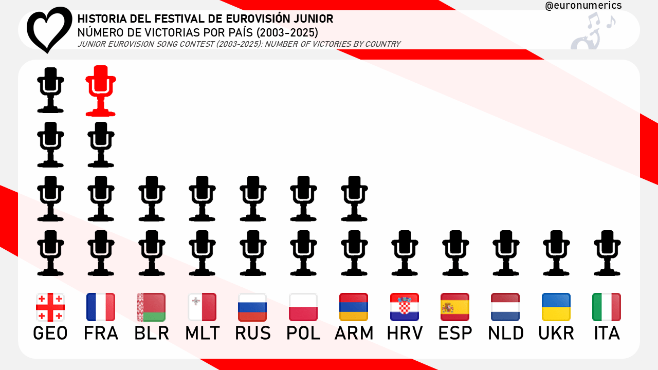 Francia se alzó con su cuarto triunfo en el festival junior y empata a victorias con Georgia como los países más laureados. Es lo mismo que hace dos años, solo que ahora empatan a 4 trofeos. El dominio de estos países es tan absoluto que no hay ninguno que cuente tres triunfos. ¿Podrá algún país hacerse hueco entre ellos?